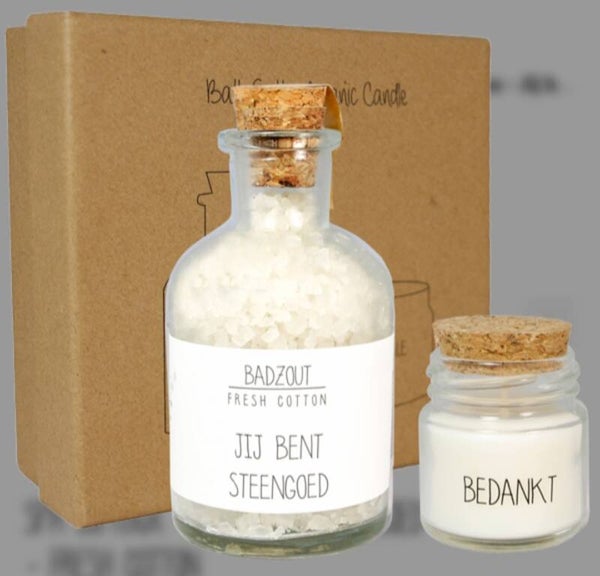 Natuurlijk badzout in een leuk glazen flesje met een geurkaarsje in een mooie giftbox. Met dit badzout en geurkaarsje kan je heerlijk ontspannen met de geur Green Tea Time. Steek het geurkaarsje aan, zet een muziekje op en you are all set voor jouw relax moment.