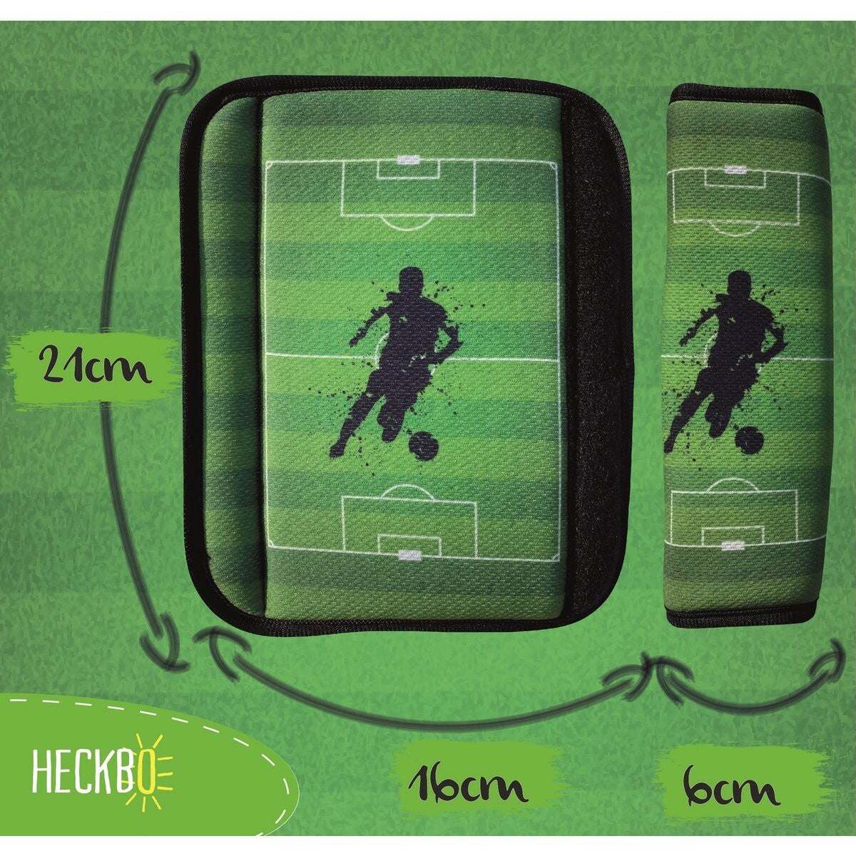 ►LEVERINGSOMVANG: 2x voetbalgordelbeschermer; Kleuren: groen, wit, zwart; achtergrond: groen/wit; rand: zwart, afmeting: 16cm x 21cm (uitgevouwen) en 6cm x 21cm (gevouwen); Materiaal: 100% polyester (buitenmateriaal) en 100% polyethyleen (vulling)